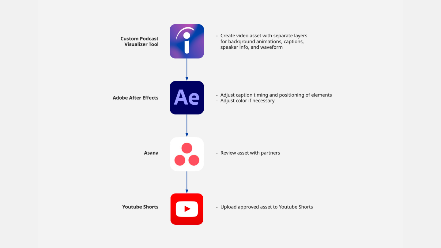 Indeed's YouTube Shorts came primarily from high-production video shoots. But, when we started to create content based on podcast audio clips, we needed a way to test what types of visuals perform best on the platform, Manually creating these visuals at scale wasn't feasible in our current workflow.